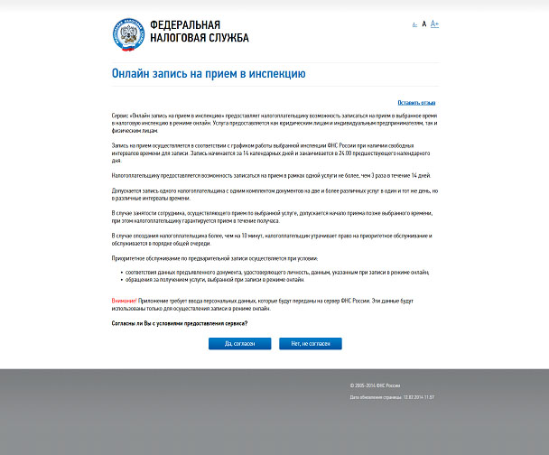 3. Стартовая страница интерактивного сервиса должна содержать описание функциональных возможностей сервиса и основные условия его предоставления пользователям. В случае необходимости ввода налогоплательщиком персональных данных при использовании сервиса в текст стартовой страницы необходимо включить соответствующее предупреждение и предусмотреть "кнопки" "Не согласен"/"Согласен".