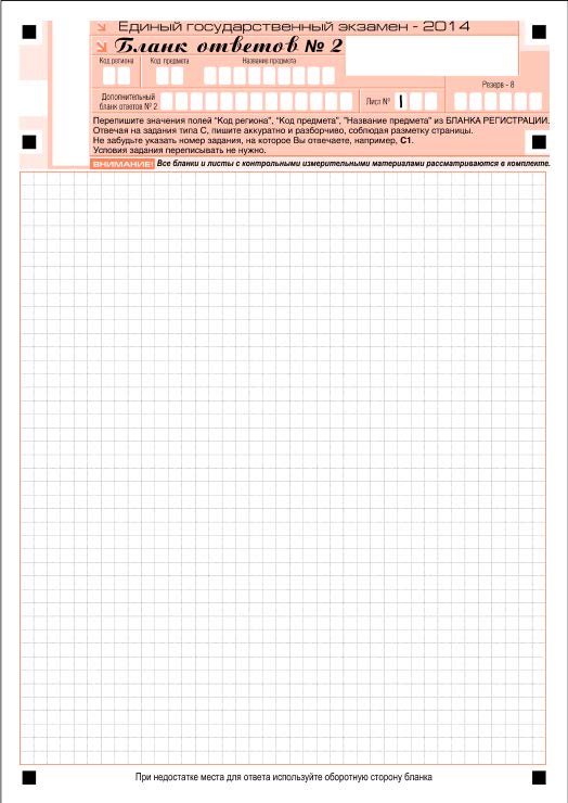 При недостатке места для ответов на лицевой стороне бланка ответов N 2 участник ЕГЭ может продолжить записи на оборотной стороне бланка, сделав внизу лицевой стороны запись "смотри на обороте". Для удобства все страницы бланка ответов N 2 пронумерованы и разлинованы пунктирными линиями "в клеточку".
