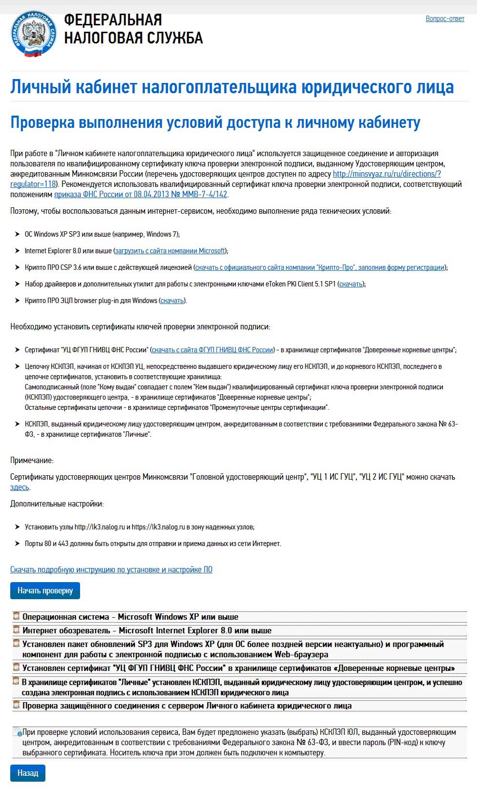 Откроется страница проверки условий подключения к "Личному кабинету налогоплательщика юридического лица":