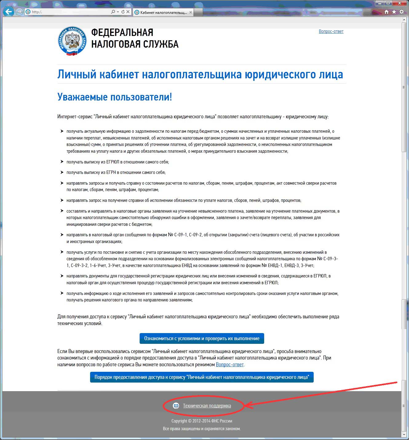 По проблемам, возникшим при подключении налогоплательщика к "Личному кабинету налогоплательщика юридического лица", а также по вопросам о функционировании сервисов "Личного кабинета налогоплательщика юридического лица" налогоплательщик обращается в службу технической поддержки.