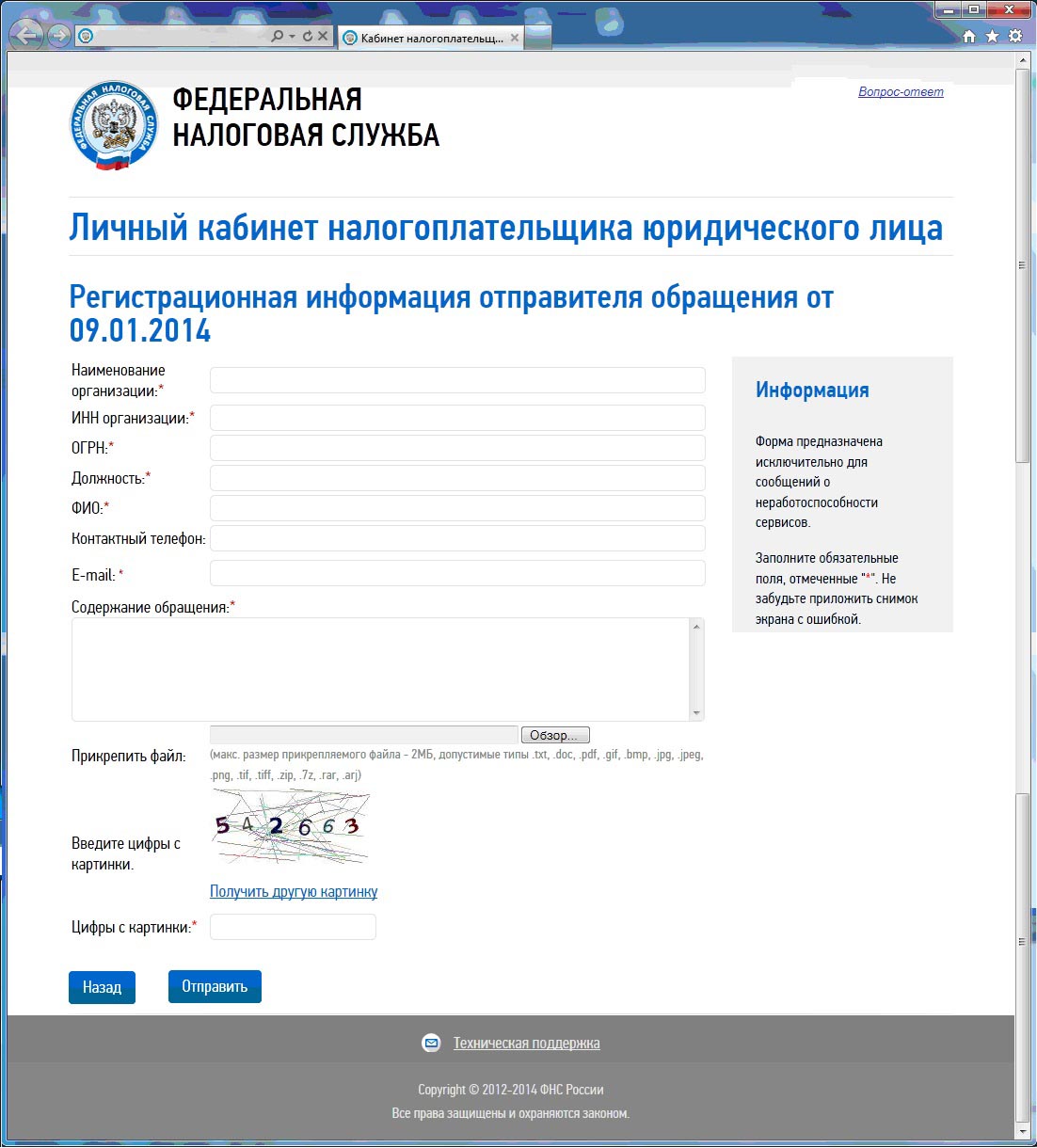 К обращению может быть прикреплен файл со скриншотами, поясняющими возникшую проблему. Перед отправкой налогоплательщик вводит цифры с картинки. Ответ на обращение направляется на адрес электронной почты, указанный в обращении, в течение 2 рабочих дней.