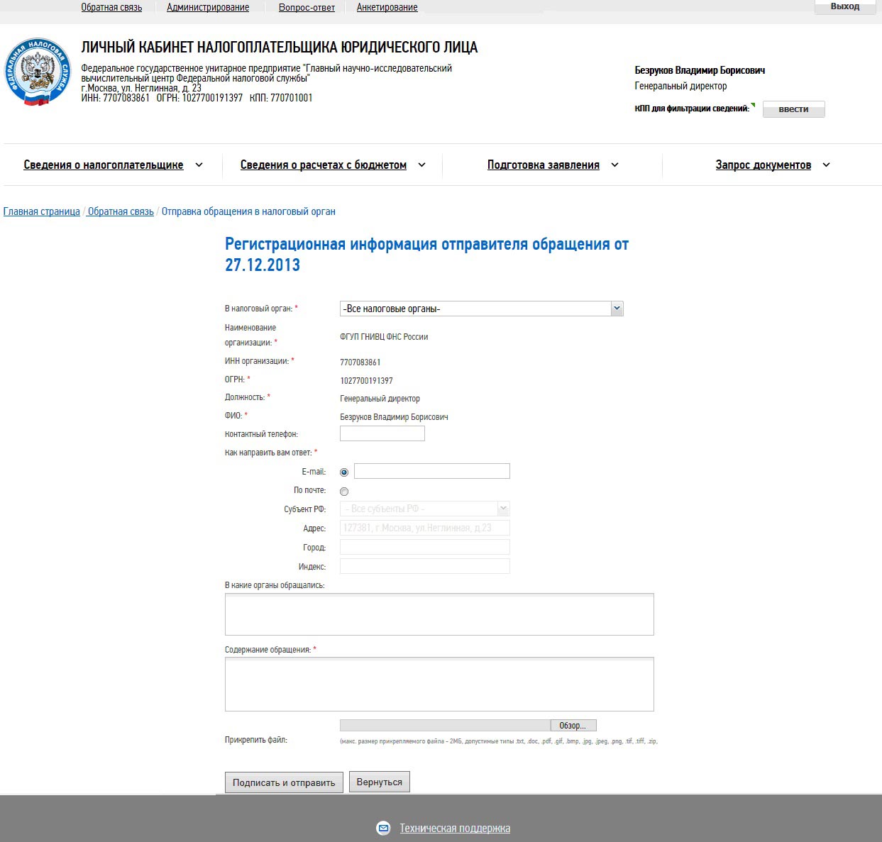 К обращению должен быть прикреплен файл со скриншотами страницы, на которой налогоплательщик выявил недостоверные или вызывающие вопросы данные. Перед отправкой налогоплательщик подписывает обращение электронной подписью.