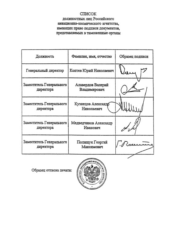 Приложение. Список должностных лиц Российского авиационно-космического агентства, имеющих право подписи документов, представляемых в таможенные органы