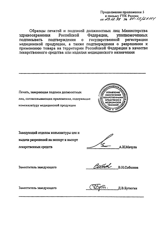 Образцы печатей и подписей должностных лиц Министерства здравоохранения Российской Федерации, уполномоченных подписывать подтверждения о государственной регистрации медицинской продукции, а также подтверждения о разрешении к применению товара на территории Российской Федерации в качестве лекарственного средства или изделия медицинского назначения