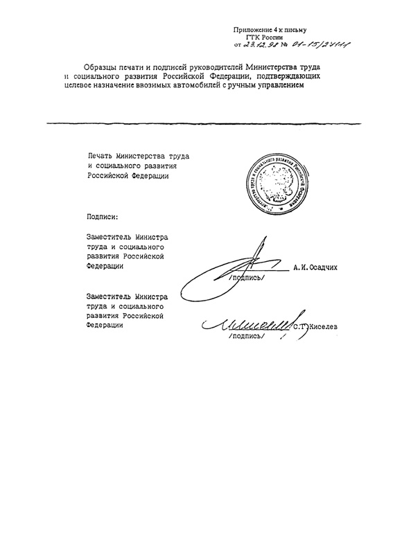 Образцы печати и подписей руководителей Министерства труда и социального развития Российской Федерации, подтверждающих целевое назначение ввозимых автомобилей с ручным управлением