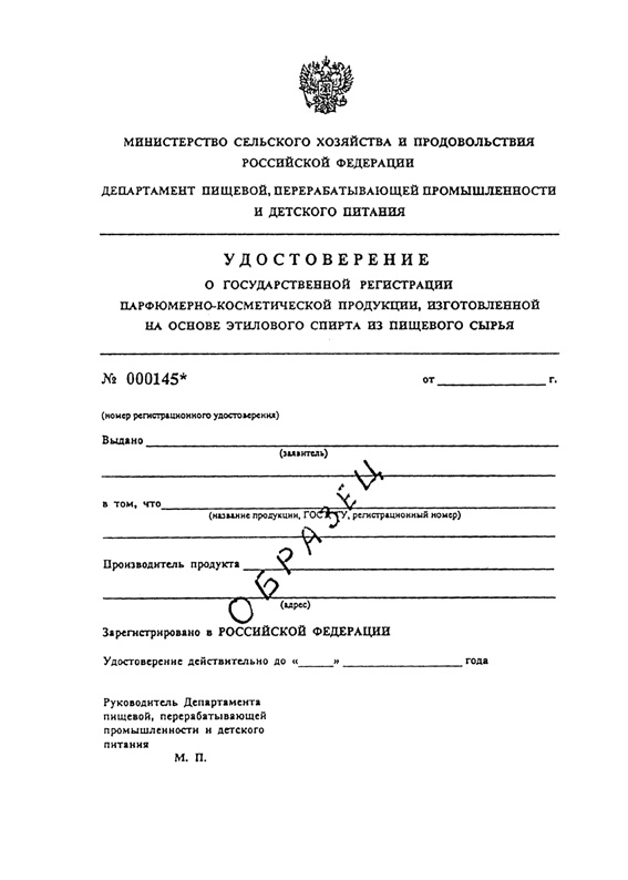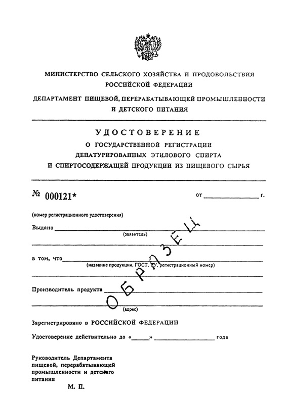 Удостоверение о государственной регистрации спиртосодержащих отходов (образец)