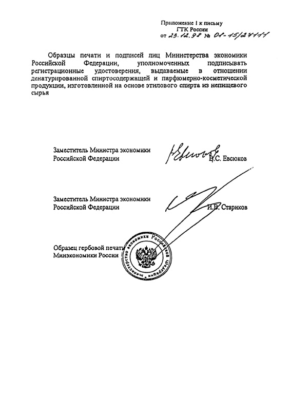Письмом ГТК РФ от 07.05.1999 N 01-15/13368 доводится до сведения и использования в работе образец подписи заместителя Министра экономики Российской Федерации, уполномоченного подписывать регистрационные удостоверения, выдаваемые в отношении денатурированной спиртосодержащей и парфюмерно-косметической продукции, изготовленной на основе этилового спирта из непищевого сырья.