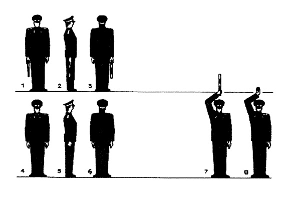 Стойка: правая рука свободно поднята вверх; кисть повернута ладонью вперед, пальцы прижаты друг к другу (остальные указания те же, что и при аналогичном положении с жезлом) (рис. 8).