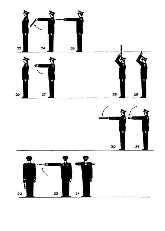 Вытянуть руку в сторону, жезл в сторону (рис. 33), затем согнуть руку перед грудью, жезл влево (рис. 34).