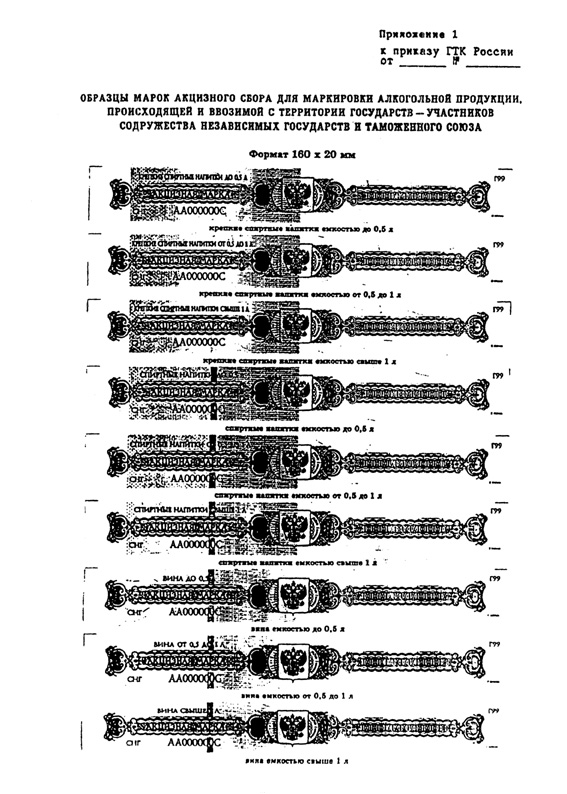 Приложение 1. ОБРАЗЦЫ АКЦИЗНЫХ МАРОК ДЛЯ МАРКИРОВКИ АЛКОГОЛЬНОЙ ПРОДУКЦИИ, ПРОИСХОДЯЩЕЙ И ВВОЗИМОЙ С ТЕРРИТОРИИ ГОСУДАРСТВ - УЧАСТНИКОВ СОДРУЖЕСТВА НЕЗАВИСИМЫХ ГОСУДАРСТВ И ТАМОЖЕННОГО СОЮЗА
