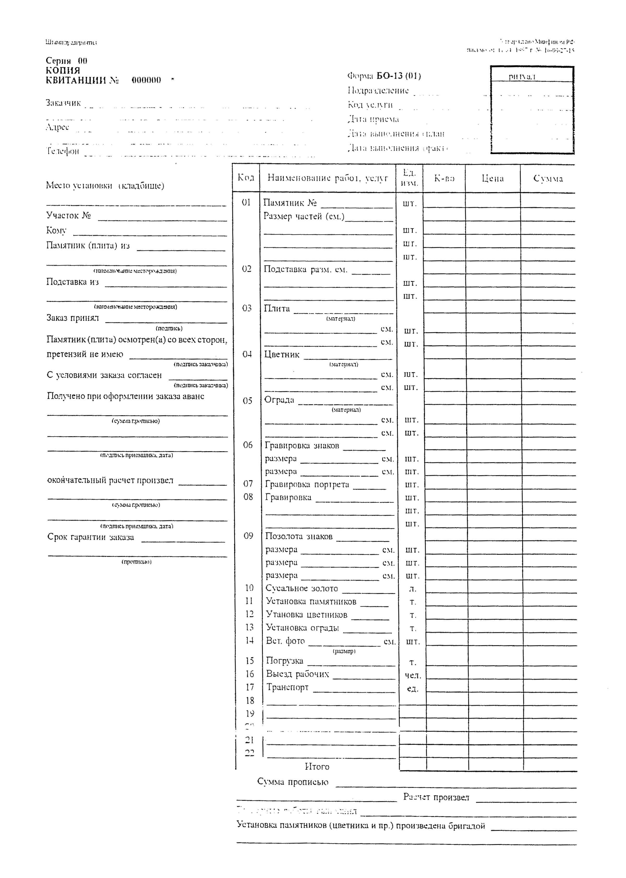 См. данный графический объект (Форма БО-13 (01): НАРЯД-ЗАКАЗ (лицевая и оборотная стороны), КВИТАНЦИЯ (лицевая и оборотная стороны), КОПИЯ КВИТАНЦИИ).