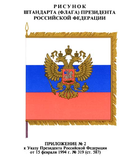 Штандарт (флаг) Президента Российской Федерации представляет собой квадратное полотнище из трех равновеликих горизонтальных полос: верхней - белого, средней - синего и нижней - красного цвета (цвета Государственного флага Российской Федерации). В центре - золотое изображение Государственного герба Российской Федерации. Полотнище окаймлено золотой бахромой. На древке штандарта (флага) крепится серебряная скоба с выгравированными фамилией, именем и отчеством Президента Российской Федерации и датами его пребывания на этом посту.