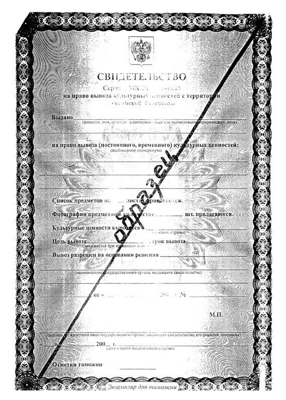 ОБРАЗЦЫ БЛАНКА СВИДЕТЕЛЬСТВА НА ПРАВО ВЫВОЗА КУЛЬТУРНЫХ ЦЕННОСТЕЙ С ТЕРРИТОРИИ РОССИЙСКОЙ ФЕДЕРАЦИИ