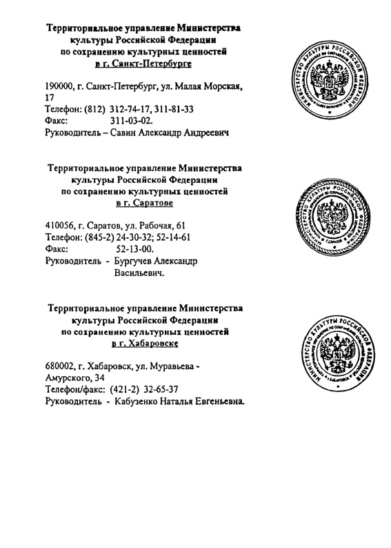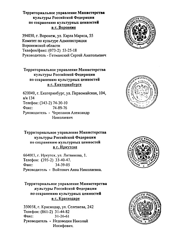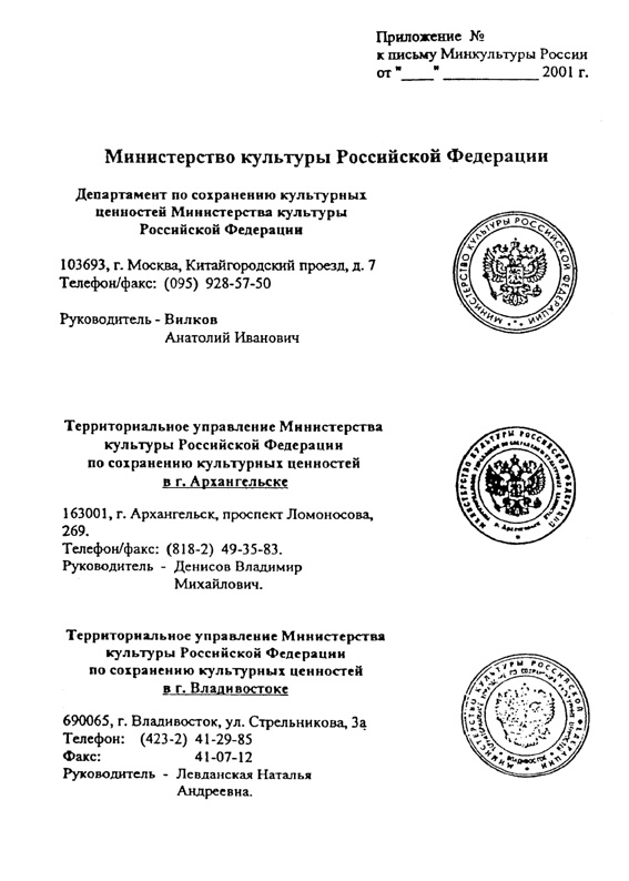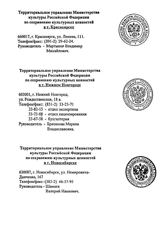 Приложение. ОБРАЗЦЫ ПЕЧАТЕЙ МИНКУЛЬТУРЫ РОССИИ И ЕГО ТЕРРИТОРИАЛЬНЫХ ОРГАНОВ ПО СОХРАНЕНИЮ КУЛЬТУРНЫХ ЦЕННОСТЕЙ