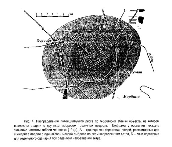 Распределение потенциального территориального риска, показывающего максимальное значение частоты поражения человека от возможных аварий для каждой точки площадки объекта и прилегающей территории, показано на рис. 4. Цифрами у изолиний указана частота смертельного поражения человека за один год (при условии его постоянного местонахождения в данной точке).
