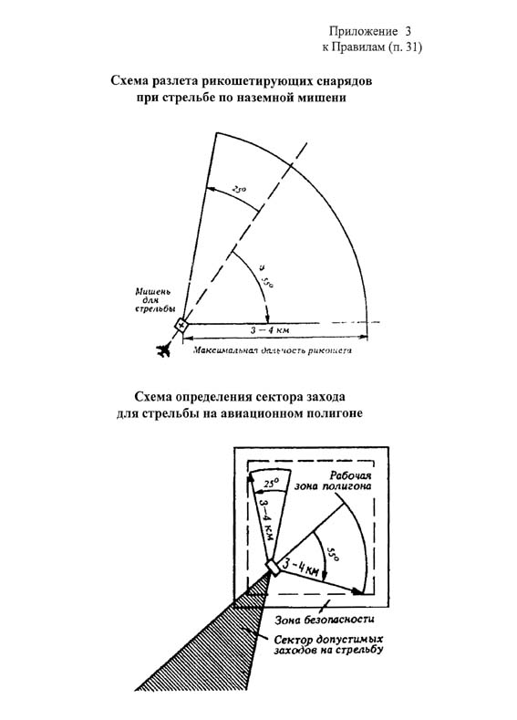 Приложение N 3. Схема разлета рикошетирующих снарядов при стрельбе по наземной мишени. Схема определения сектора захода для стрельбы на авиационном полигоне