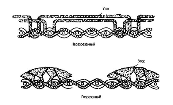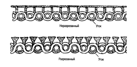 Ткани с основным ворсом также производят способом, при котором два полотна вырабатывают лицом к лицу с общей ворсовой основой; затем их разделяют разрезанием и получают два полотна ткани с разрезным ворсом.
