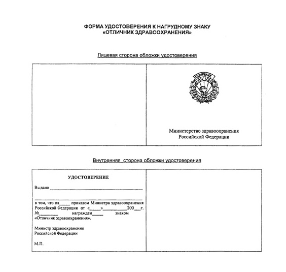 Форма удостоверения к нагрудному знаку "Отличник здравоохранения"