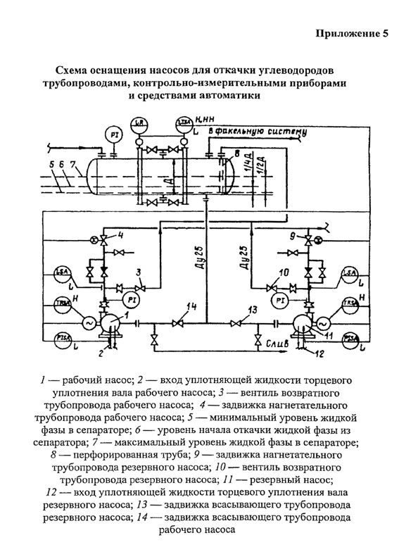Приложение 5. Схема оснащения насосов для откачки углеводородов трубопроводами, контрольно-измерительными приборами и средствами автоматики