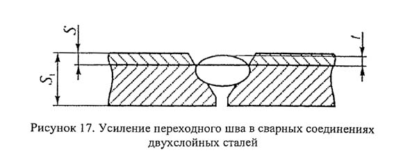 усиление t переходного шва (рисунок 17) в сварных соединениях двухслойных сталей выше линии раздела слоев на величину более 0,3S (S - толщина плакирующего слоя, Si - толщина листа);