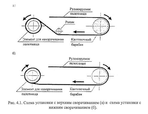 4.5.1. Полотнища должны собираться, свариваться, контролироваться и сворачиваться в рулоны на специальных установках для рулонирования, действующих по двум основным схемам (с нижним и верхним сворачиванием), показанным на рис. 4.1.