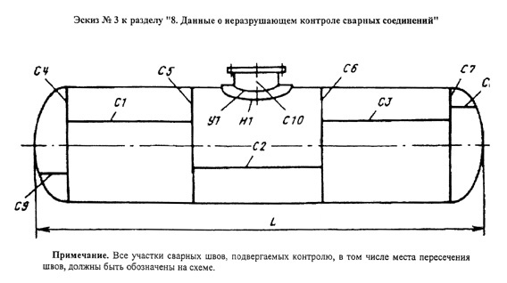 Примечание. Все участки сварных швов, подвергаемых контролю, в том числе места пересечения швов, должны быть обозначены на схеме.