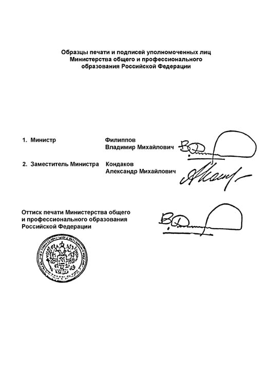 Образцы печати и подписей уполномоченных лиц Министерства общего и профессионального образования Российской Федерации