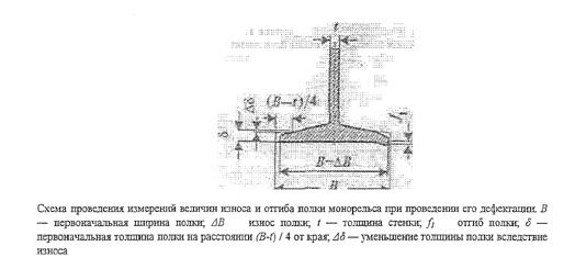 Схема проведения измерений величин износа и отгиба полки