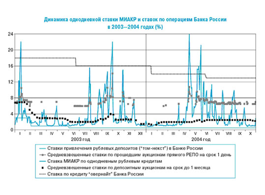 Динамика однодневной ставки МИАКР и ставок по операциям Банка России в 2003 - 2004 годах (%)
