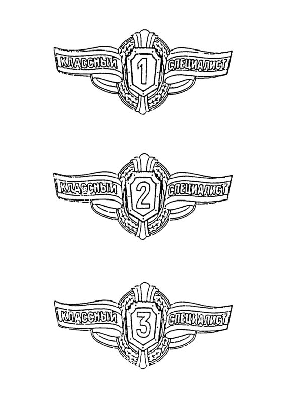 Знак из металла золотистого и серебристого цвета с эмалью представляет собой фигурный щит, обрамленный венком из дубовых листьев на вьющейся ленте. На концах ленты надпись: слева от щита - "классный", справа от щита - "специалист". Щит синий, окаймлен белой полосой, в центре щита - белая рельефная цифра "1", "2" или "3", обозначающая, соответственно, классность специалиста: специалист 1, 2 или 3 класса.