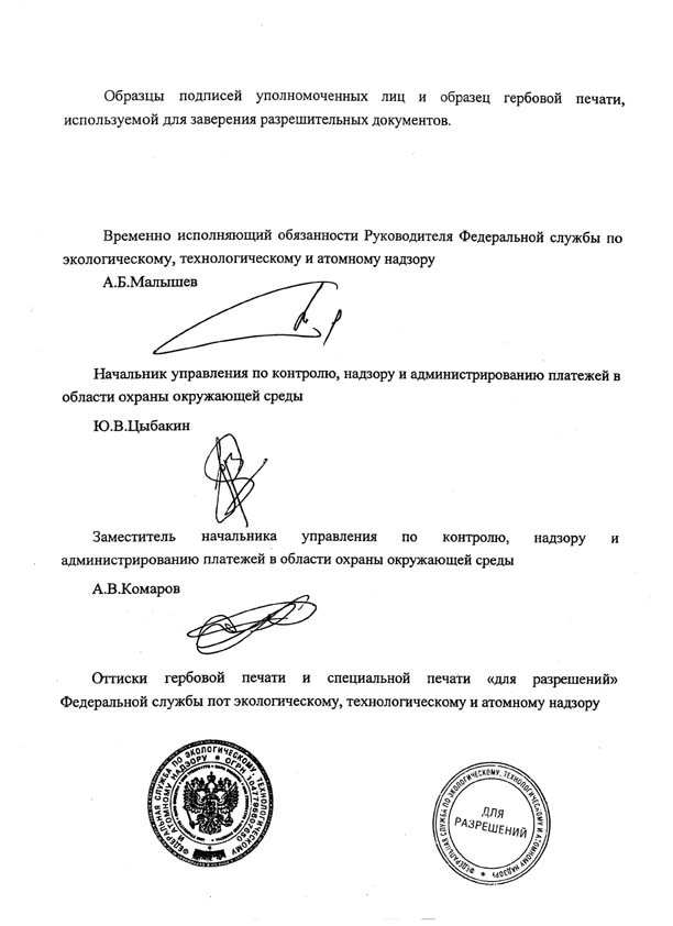 Образцы подписей уполномоченных лиц и образец гербовой печати, используемой для заверения разрешительных документов
