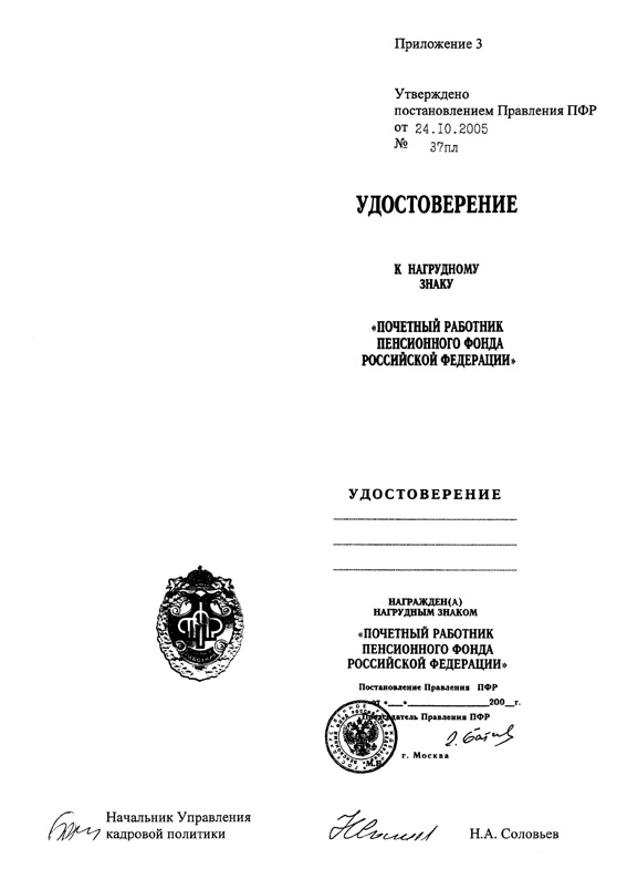 Приложение 3. Удостоверение к нагрудному знаку "Почетный работник Пенсионного фонда Российской Федерации"