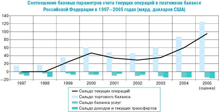 Соотношение базовых параметров счета текущих операций в платежном балансе Российской Федерации в 1997 - 2005 годах (млрд. долларов США)