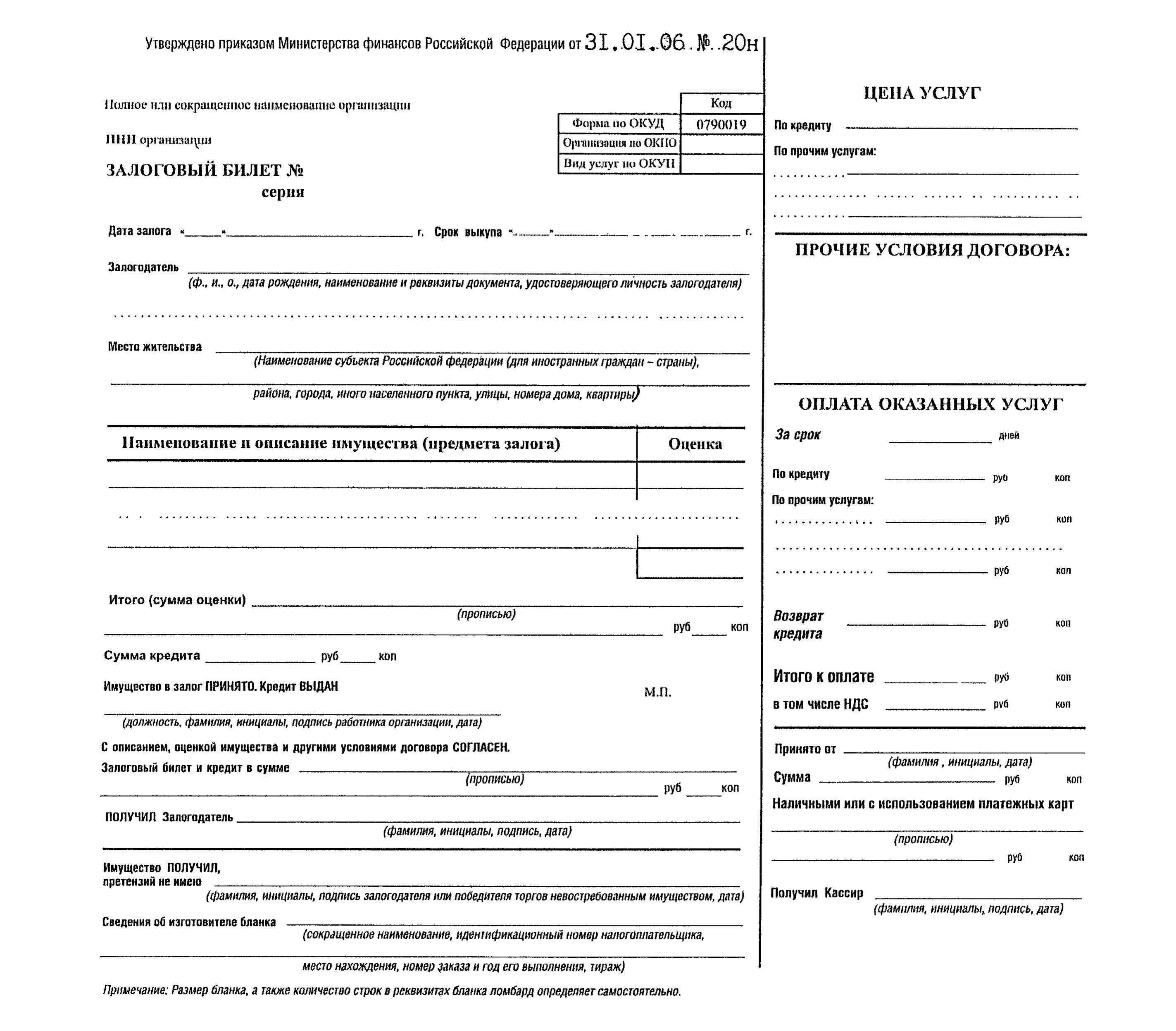 Примечание: Размер бланка, а также количество строк в реквизитах бланка ломбард определяет самостоятельно.