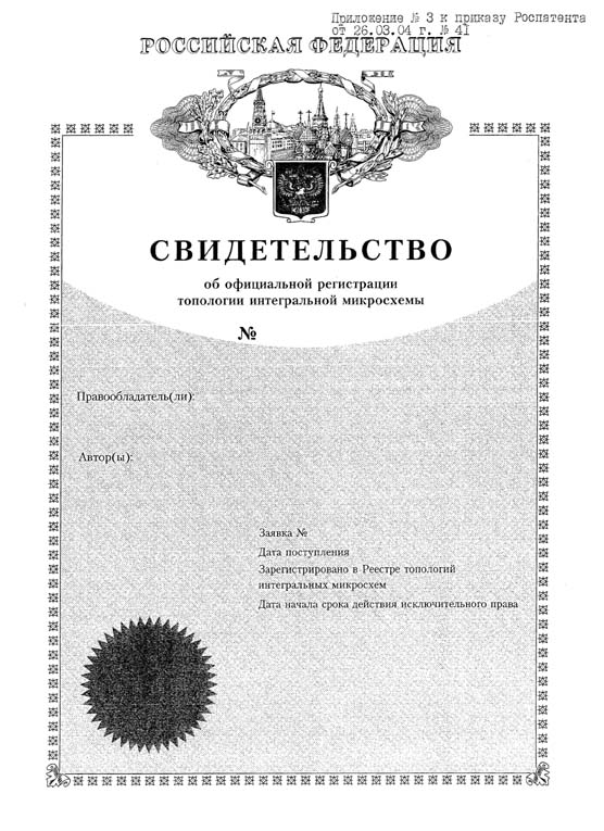 Приложение 3. Свидетельство об официальной регистрации топологии интегральной микросхемы