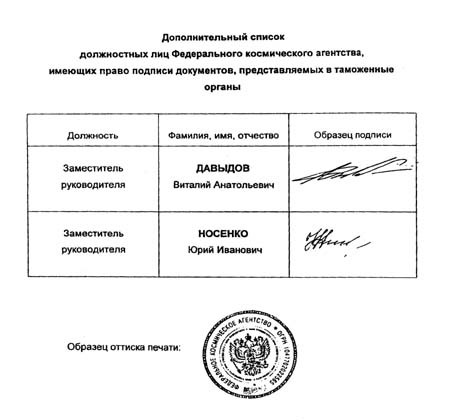 Приложение. Дополнительный список должностных лиц Федерального космического агентства, имеющих право подписи документов, представляемых в таможенные органы