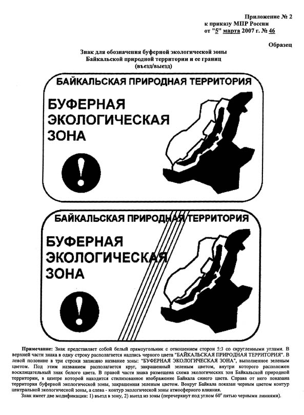 Примечание. Знак представляет собой белый прямоугольник с отношением сторон 5 : 3 со скругленными углами. В верхней части знака в одну строку располагается надпись черного цвета "БАЙКАЛЬСКАЯ ПРИРОДНАЯ ТЕРРИТОРИЯ". В левой половине в три строки записано название зоны "БУФЕРНАЯ ЭКОЛОГИЧЕСКАЯ ЗОНА", выполненное зеленым цветом. Под этим названием располагается круг, закрашенный зеленым цветом, внутри которого расположен восклицательный знак белого цвета. В правой части знака размещена схема экологических зон Байкальской природной территории, в центре которой находится стилизованное изображение Байкала синего цвета. Справа от него показана территория буферной экологической зоны, закрашенная зеленым цветом. Вокруг Байкала показан черным цветом контур центральной экологической зоны, а слева - контур экологической зоны атмосферного влияния.