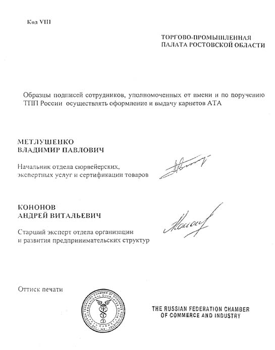 Образцы подписей сотрудников, уполномоченных от имени и по поручению ТПП России осуществлять оформление и выдачу карнетов АТА