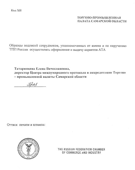 Образцы подписей сотрудников, уполномоченных от имени и по поручению ТПП России осуществлять оформление и выдачу карнетов АТА