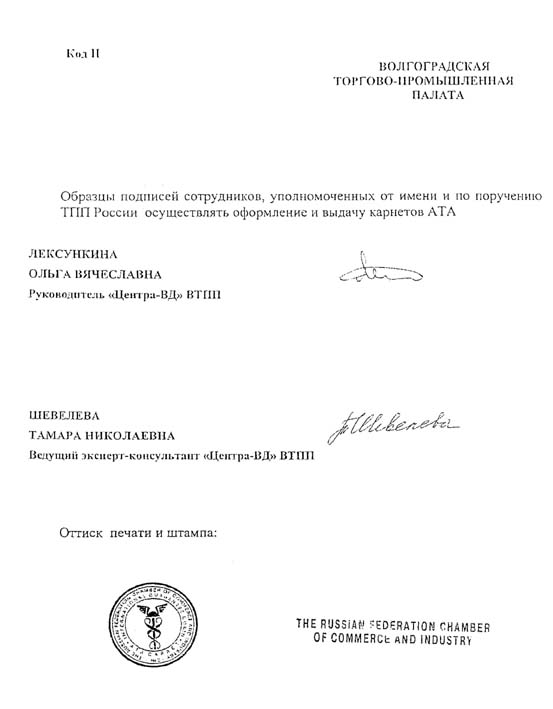 Образцы подписей сотрудников, уполномоченных от имени и по поручению ТТГП России осуществлять оформление и выдачу карнетов АТА