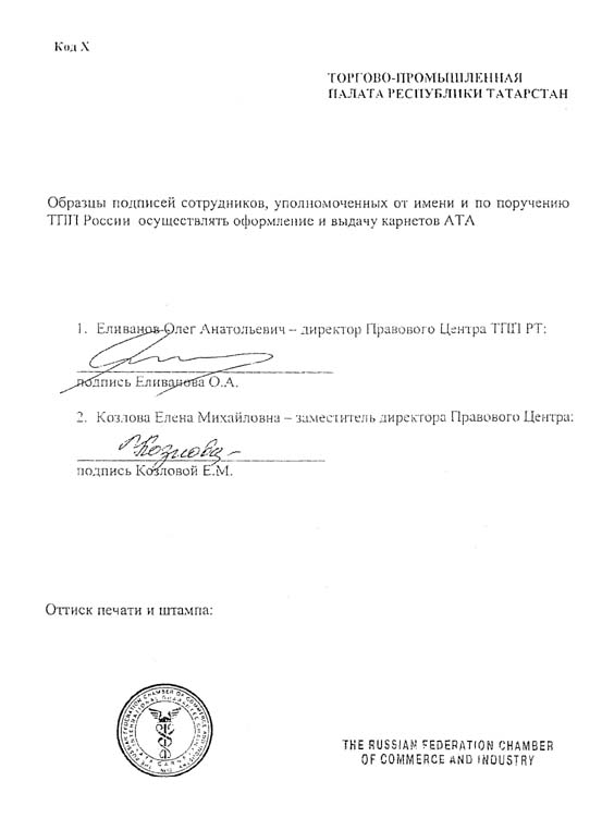 Образцы подписей сотрудников, уполномоченных от имени и по поручению ТПП России осуществлять оформление и выдачу карнетов АТА