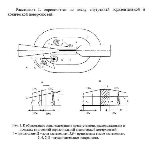 2 - зона "затенения"; 5, 6 - препятствия