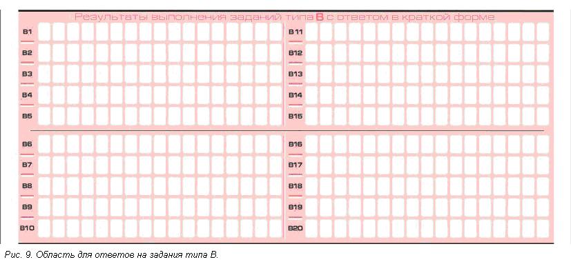 Краткий ответ можно давать только в виде слова, одного целого числа или комбинации букв и цифр, если в инструкции по выполнению работы не указано, что ответ можно дать с использованием запятых для записи ответа в виде десятичной дроби или в виде перечисления требуемых в задании пунктов. Каждая цифра, буква, запятая или знак минус (если число отрицательное) записывается в отдельную клеточку, строго по образцу из верхней части бланка. Не разрешается использовать при записи ответа на задания типа B никаких иных символов, кроме символов кириллицы, латиницы, арабских цифр, запятой и знака дефис (минус).