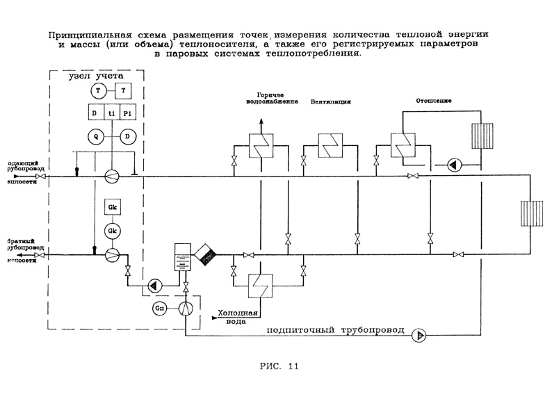 Принципиальная схема размещения точек измерения массы (или объема) теплоносителя, его температуры и давления, состав измеряемых и регистрируемых параметров теплоносителя в паровых системах теплопотребления приведены на рис. 11.